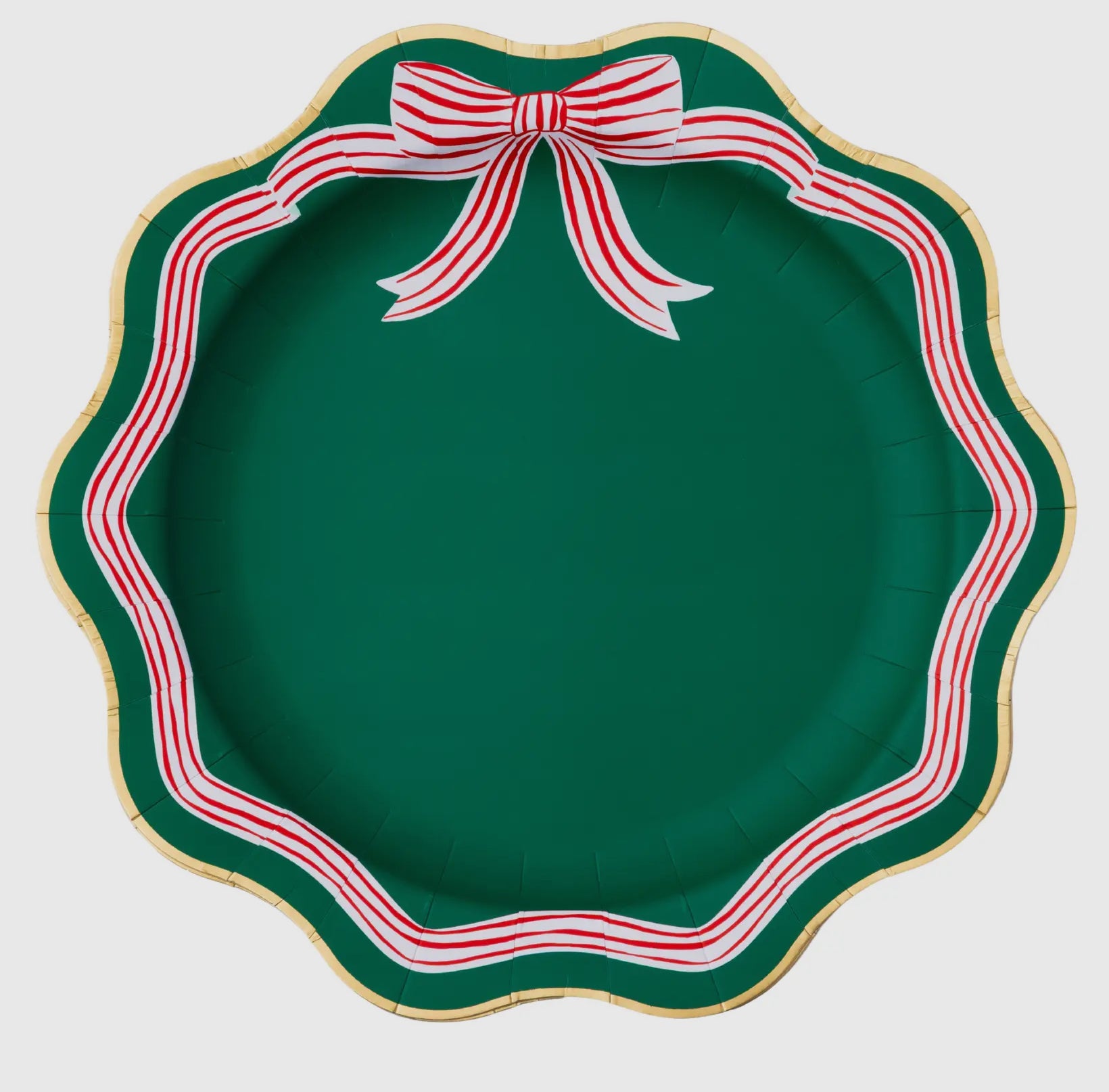 Elevate your Christmas table with our Elegant Green Peppermint Bow Dinner Plates! Featuring a red peppermint striped bow and whimsical scalloped edges, these plates add sophistication and the charm of chic china to any place setting.