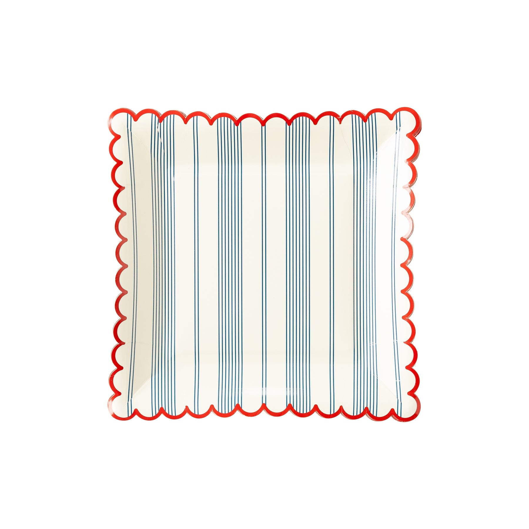 Classic summer coastal style meets vintage Americana with these striped scalloped plates. Designed with a festive blue stripe pattern that will bring a festive touch to the table at your next patriotic celebration or beach side picnic. And with a red edge scalloped edge, these dinner sized plates are the perfect way to enjoy summer time favorites at your Fourth of July celebrations!